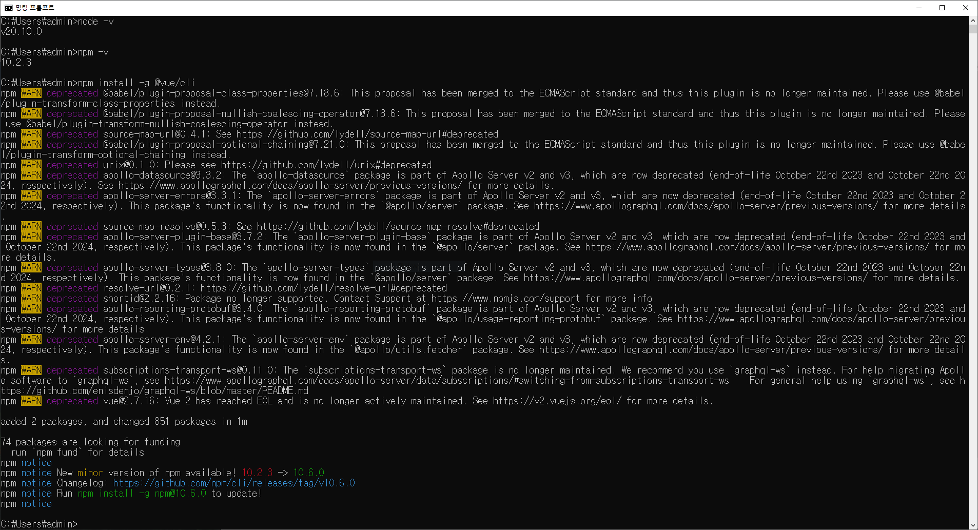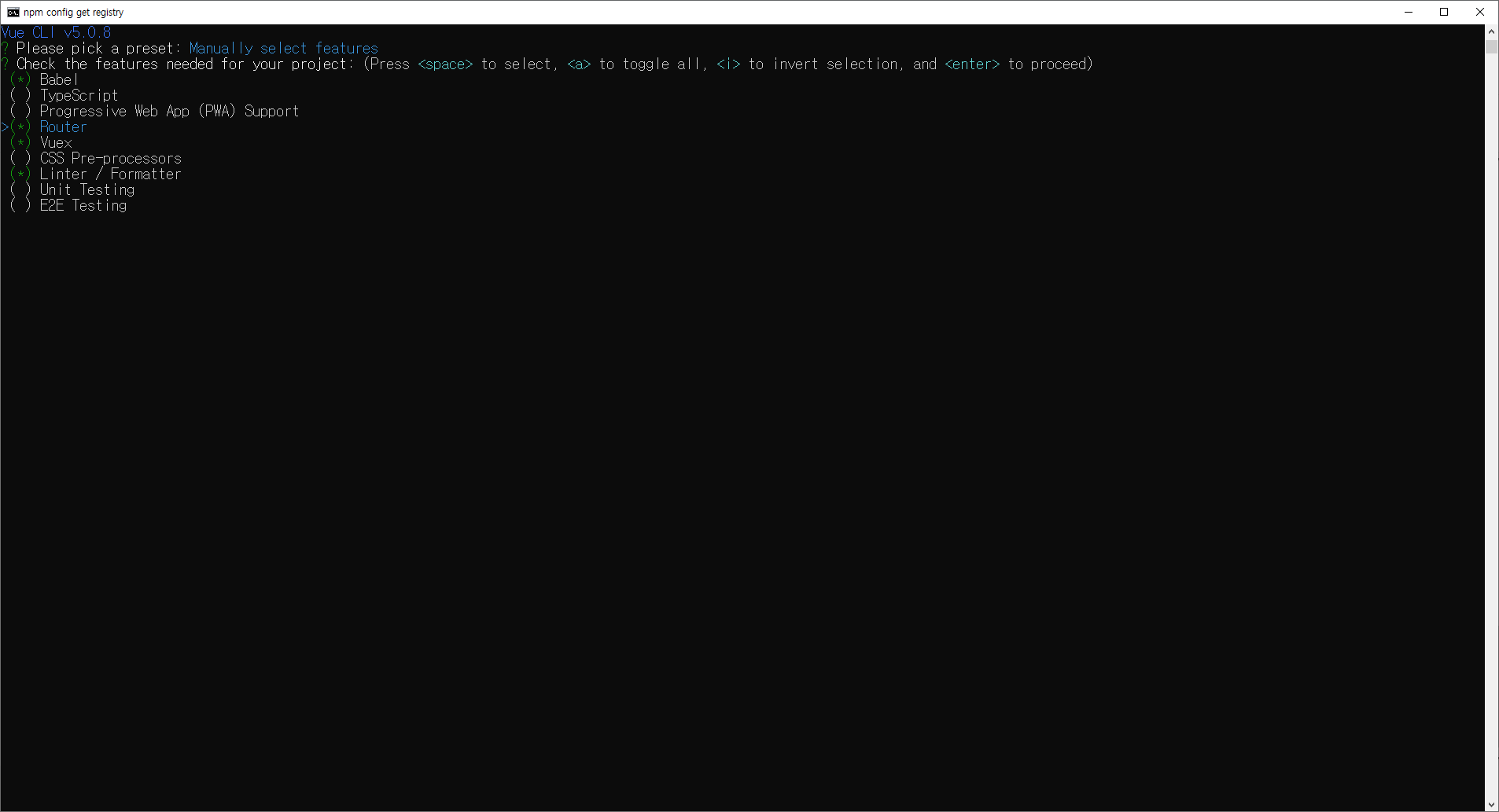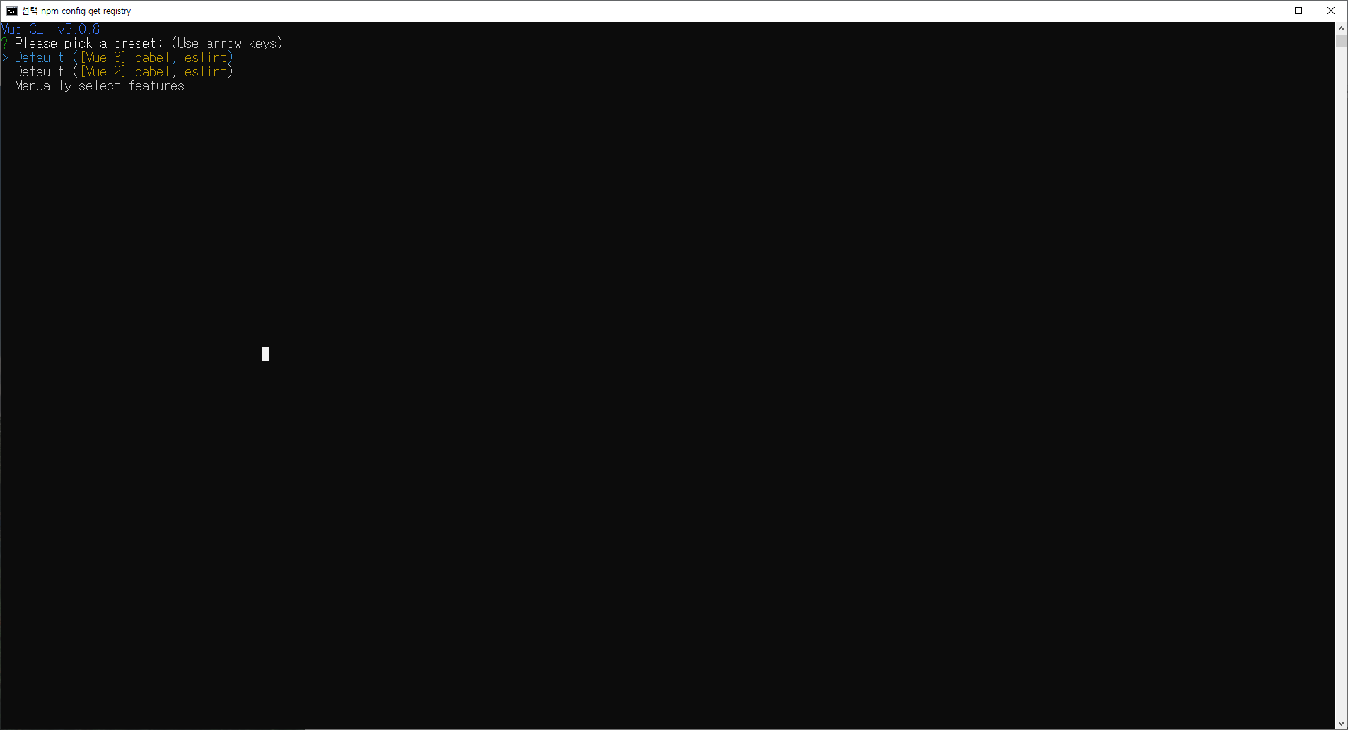 - 설치확인인 끝났다면 다음으로는 아래의 명령어를 통하여 Vue.js 프로젝트를 생성해보자.
